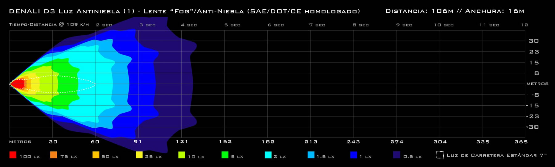 Las luces antiniebla DENALI D3 son las más potentes disponibles en el mercado y proporcionan un alcance de haz de 137 m y un ancho de haz de 91 m. No hay otra luz antiniebla legal que se acerque a esta intensidad, ya que la lente única está diseñada específicamente para enfocar la luz máxima permitida dentro de las zonas designadas para las regulaciones de EE. UU. SAE/DOT y la UE. Homologación Luces DENALILas luces DENALI se diseñaron originalmente para el mercado de EE.UU. y posteriormente se comercializaron en el resto del mundo, incluida la UE. No obstante las luces DENALI siguen demandadas en España por su calidad. Tenga en cuenta que NO existe una categoría en la UE para "luces auxiliares". Las luces delanteras adicionales solo se pueden designar como "luces antiniebla". "Luz de carretera" significa que se puede usar una luz adicional con la luz de carretera existente, pero NO se pueden usar DOS luces con la luz de carretera existente. En este caso, la función de la luz de carretera original debería anularse. Puede descargar los documentos de homologación desde la página web DENALI.D2 Luces Auxiliares D3 Luces "Driving" D3 Fog Lights D4 Luces Auxiliares D7 Luces Auxiliares DM Luces auxiliares DR1 Luces auxiliares S4 Luces Auxiliares Patrón de HazUsando dos luces: Comparativa entre las DENALI D3, D4, D7 Características